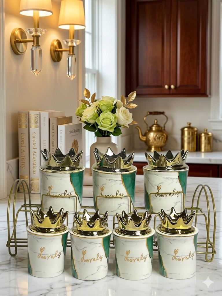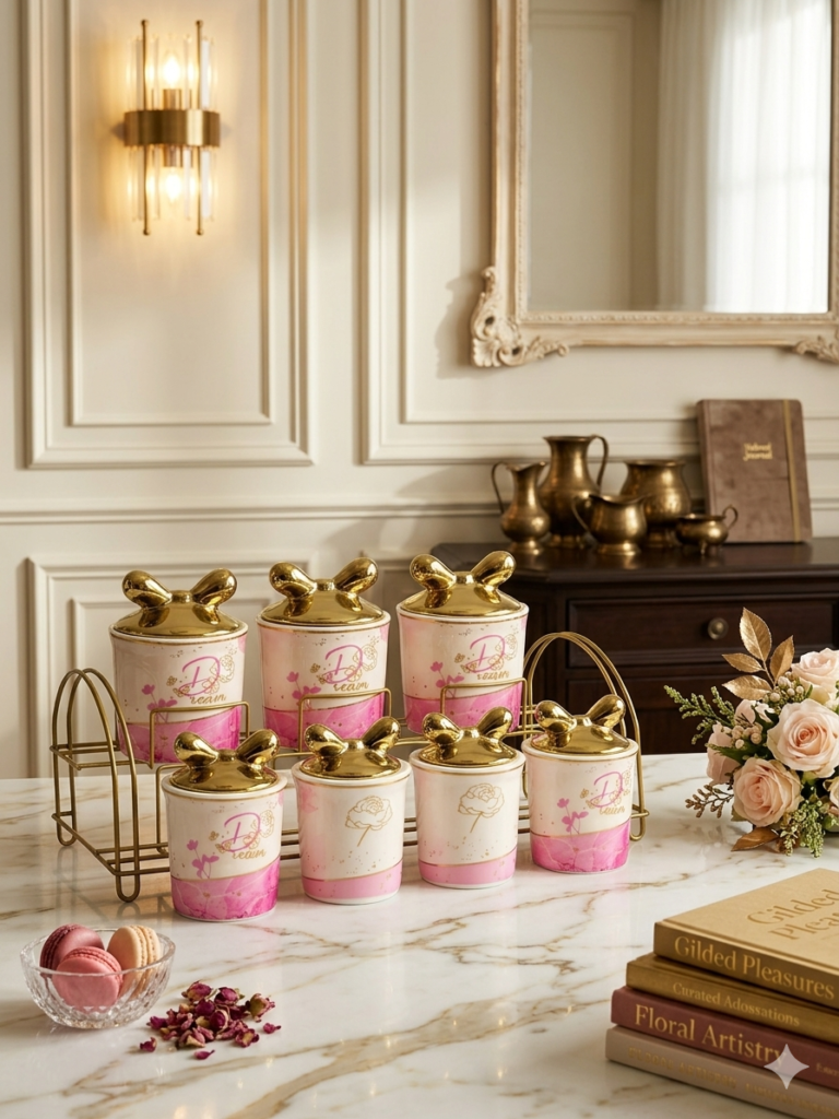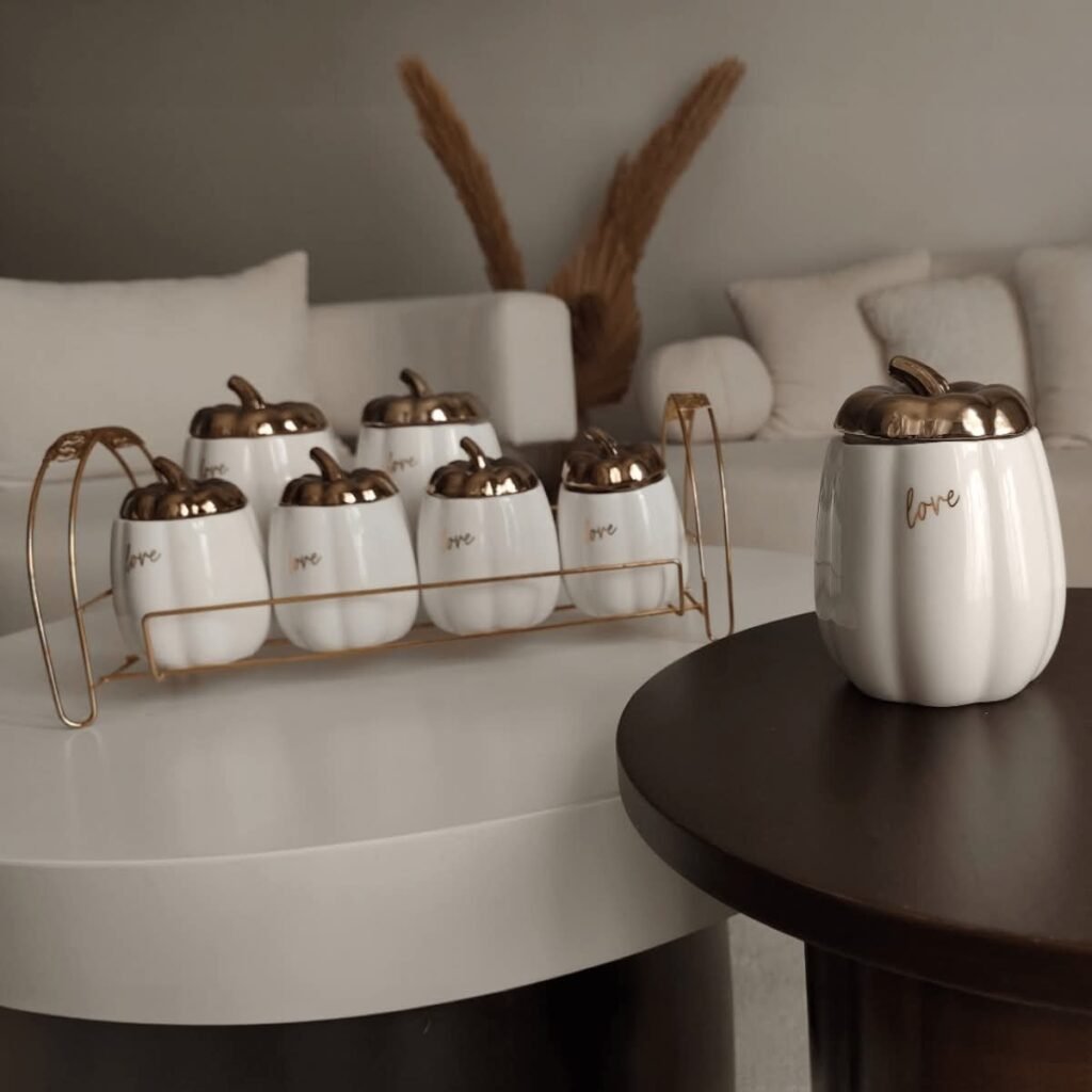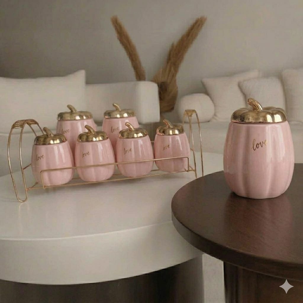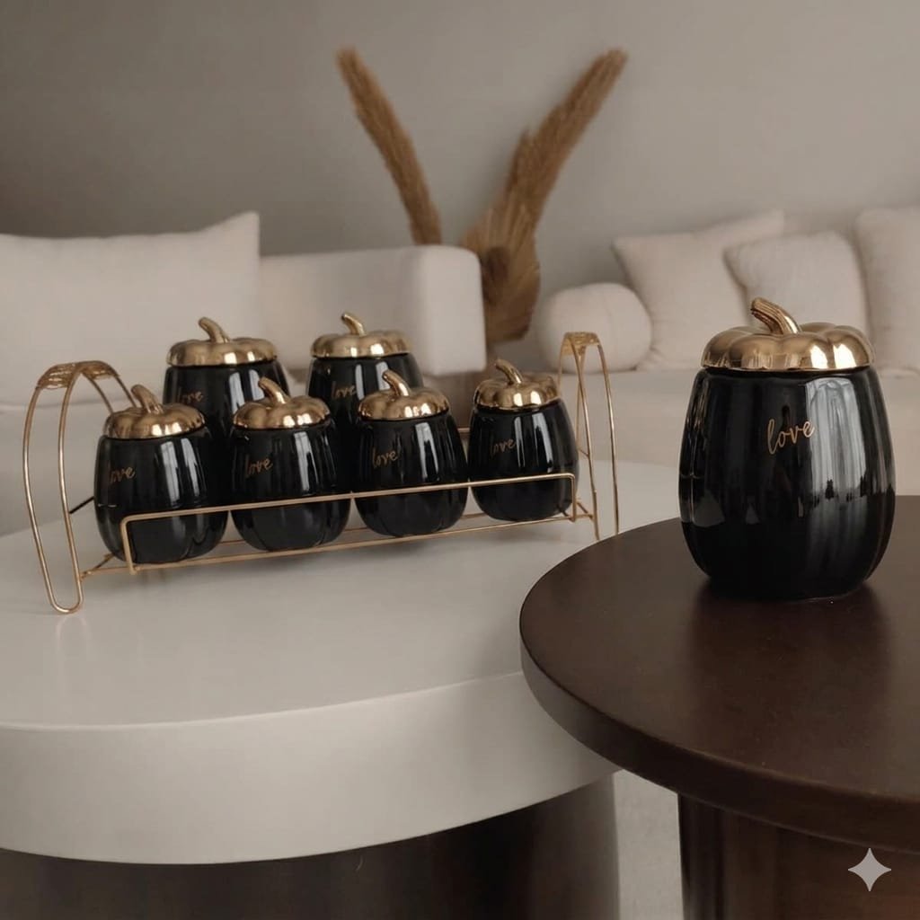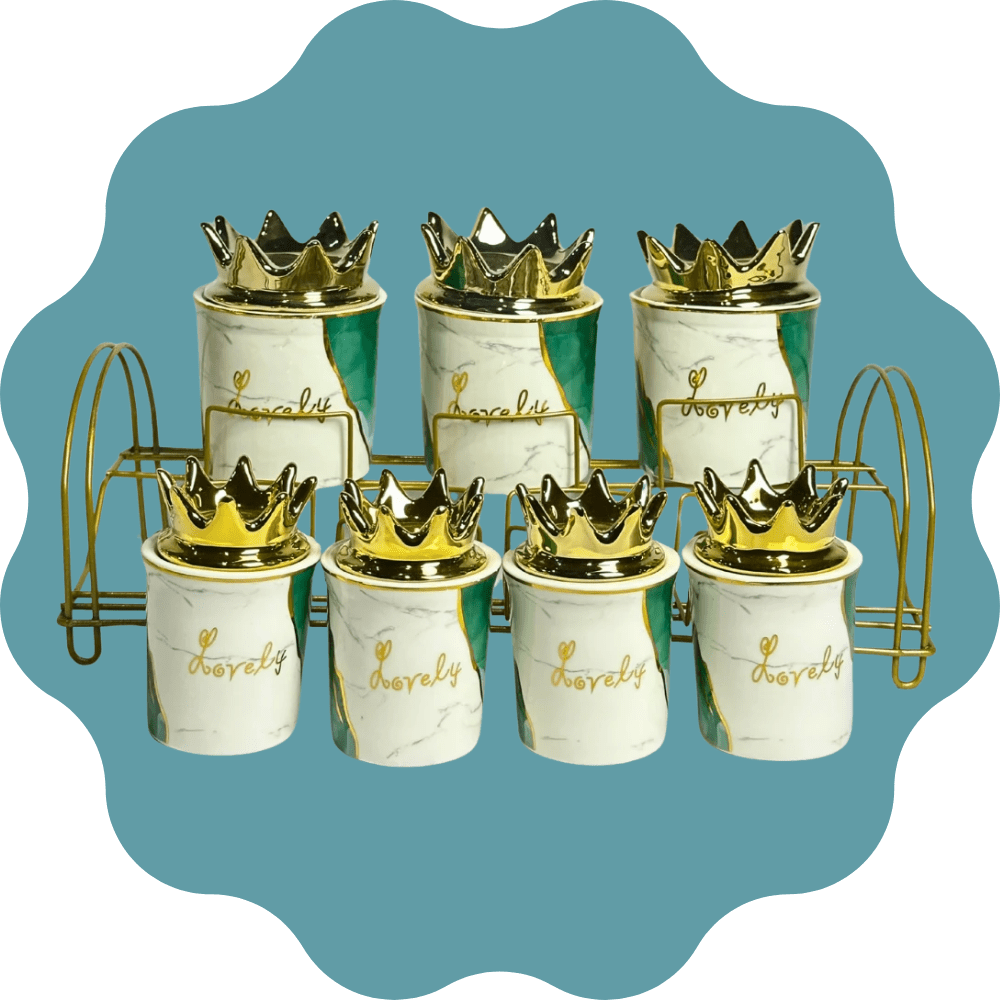 طقم توابل مكون من 7 قطع. يتضمن 3 قطع كبيرة و 4 قطع صغيرة، مزخرف بأغطية فيونكة بلون ذهبي أنيق، مما يضفي لمسة من الفخامة والتميز على مطبخك. الأغطية الفاخرة تحافظ على نضارة التوابل وتخزينها بشكل محكم. يأتي الطقم مع حامل عملي يسهل تنظيم التوابل وترتيبها بشكل مرتب وآمن. يوفر لك سهولة الوصول إليها في أي وقت. مثالي لتنظيم التوابل بشكل أنيق وعصري في مطبخك
