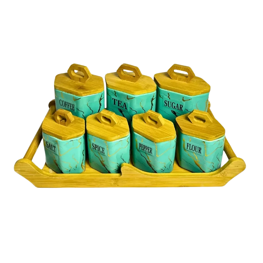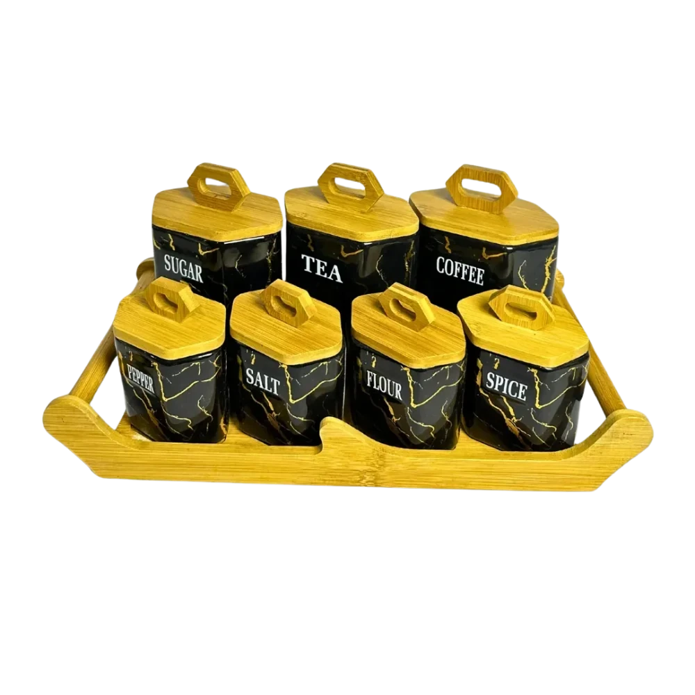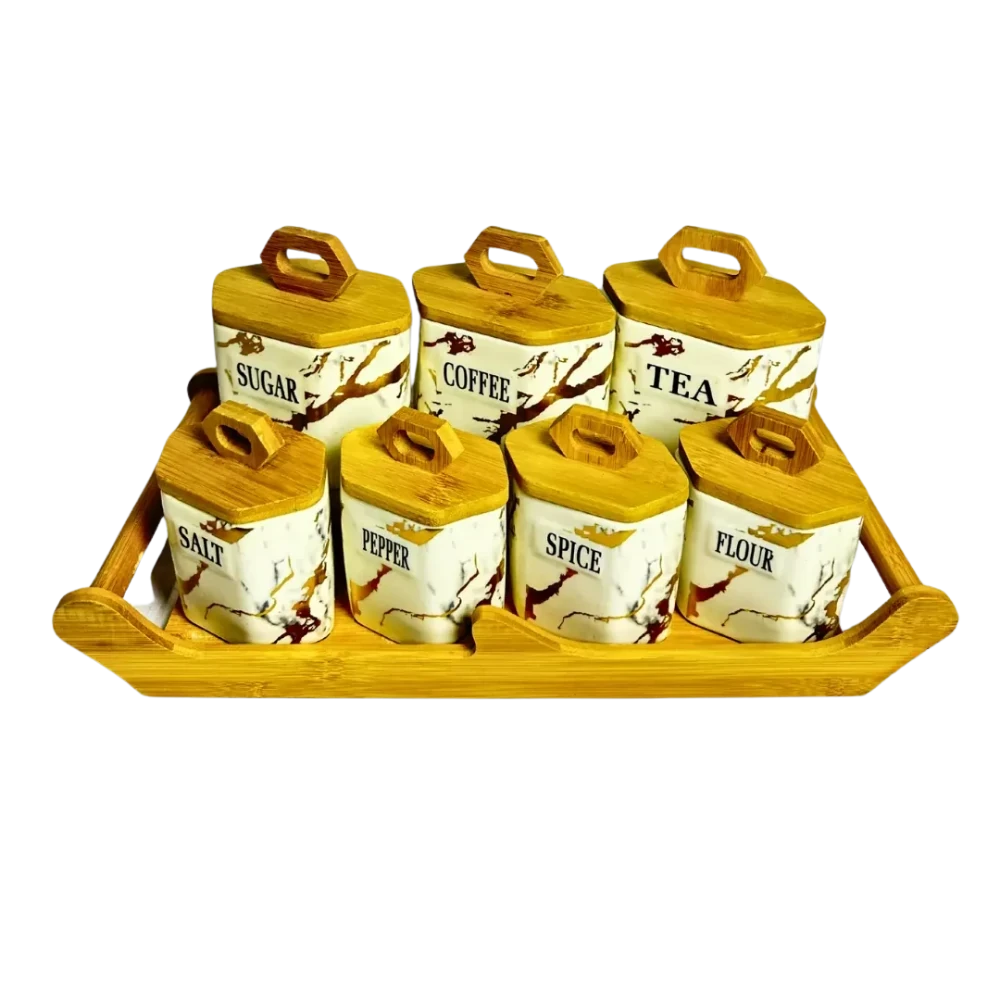 طقم توابل مكون من 7 قطع. يتضمن 3 قطع كبيرة و 3 قطع صغيرة مع غطاء خشبي أنيق، مثالي لتنظيم وتخزين التوابل في مطبخك. تأتي القطع الكبيرة لتخزين التوابل الأكثر استخدامًا، بينما توفر القطع الصغيرة مكانًا للتوابل ذات الكميات المحدودة. الأغطية الخشبية تضيف لمسة من الجمال الطبيعي، والطقم مزود بحامل عملي يسهل الوصول إلى التوابل وتنظيمها بشكل مرتب، مما يوفر لك سهولة الاستخدام والحفاظ على ترتيب المطبخ.