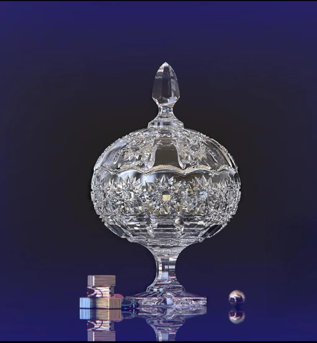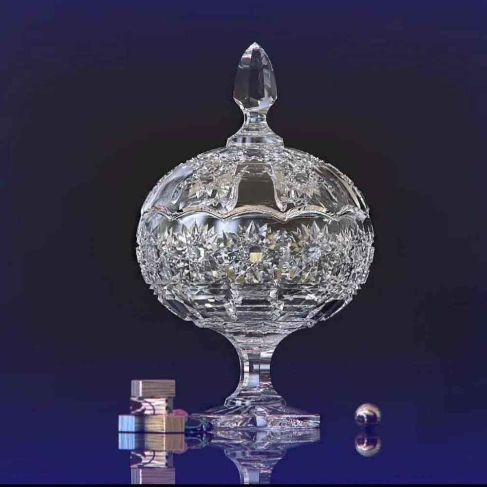 بنبونيرة زجاجية فاخرة – لمسة أنيقة لتقديم الحلوياتبنبونيرة سادة مزخرفة بحفر دقيق، مصنوعة من الزجاج عالي الجودة، وتأتي مع غطاء وقاعدة لتوفير حماية وحفظ مثالي للحلوى.