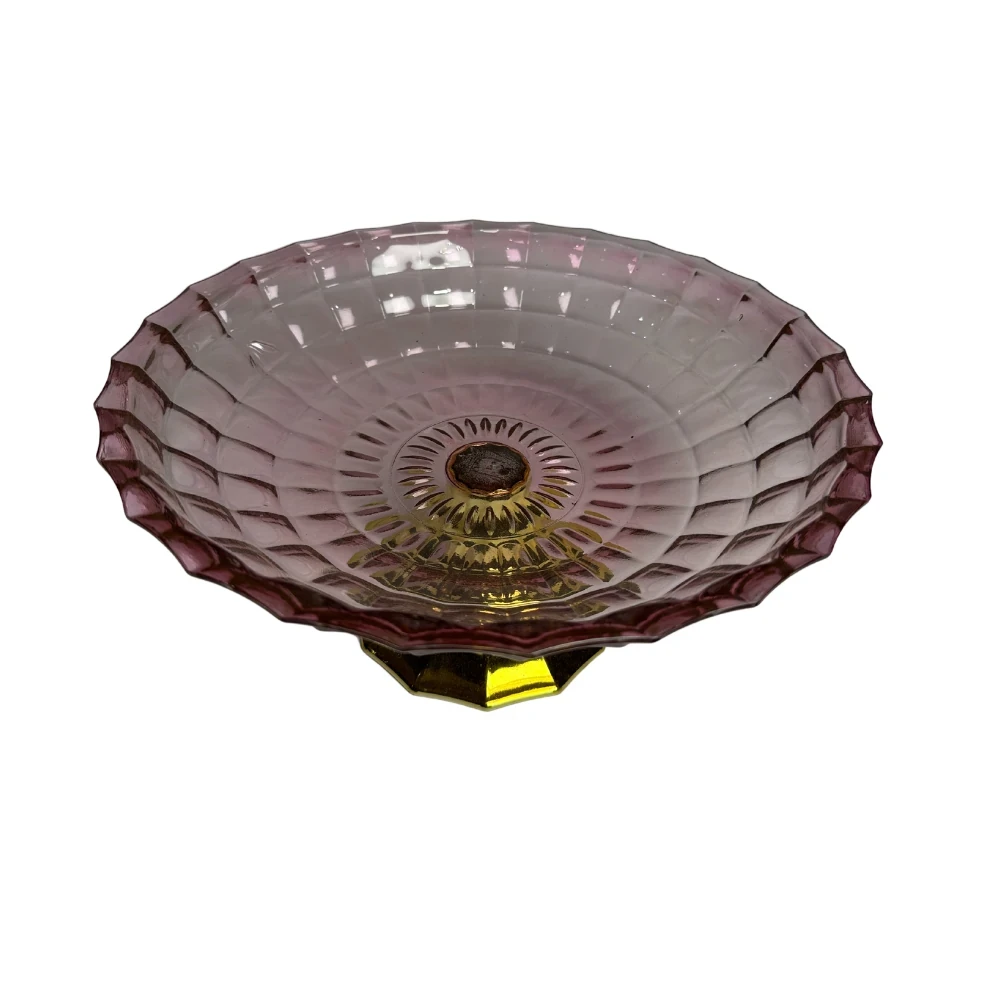 طبق فاكهة مصنوع من الزجاج الفاميّه الفاخر، مزود بقاعدة ذهبية أنيقة تضيف لمسة من الفخامة والرفاهية لمائدتك.