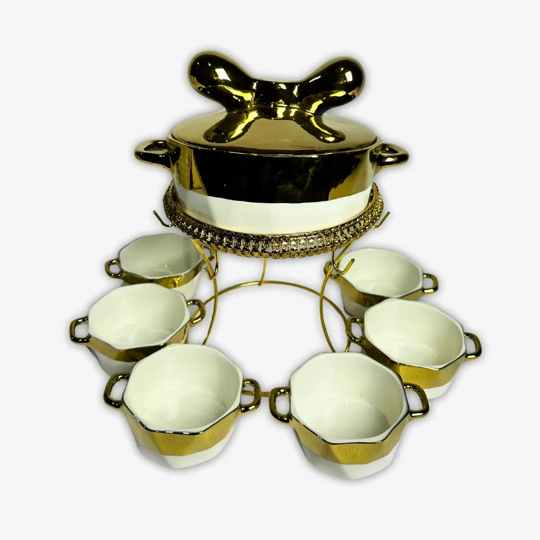 طقم شوربة بالحلة غطاء فيونكة على حامل ذهبي