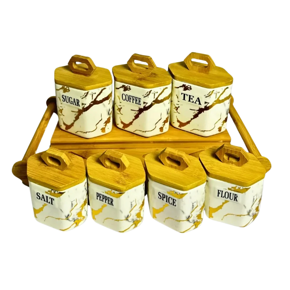 توابل مكون من 7 قطع. يتضمن 3 قطع كبيرة و 3 قطع صغيرة مع غطاء خشبي أنيق، مثالي