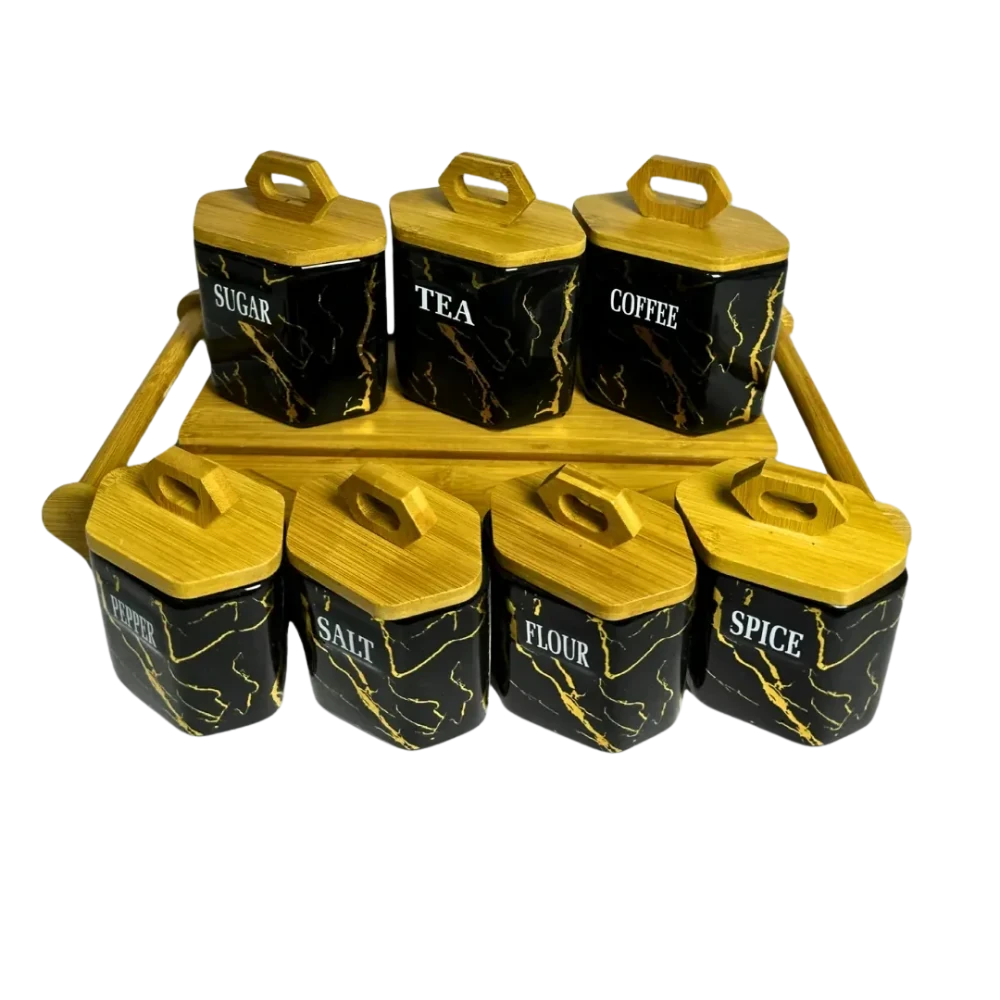 توابل مكون من 7 قطع. يتضمن 3 قطع كبيرة و 3 قطع صغيرة مع غطاء خشبي أنيق، مثالي