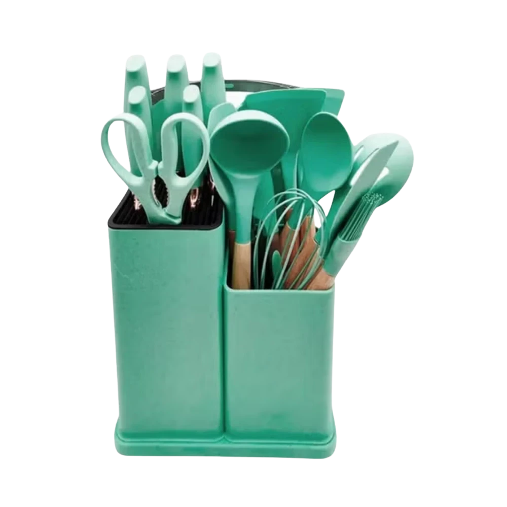 طقم توزيع مميز يشمل: كبشة – مغرفة – ملعقة كبيرة – مقصوصة، بالإضافة إلى طقم سكاكين متنوع الأشكال والاستخدامات مع الأورمة العملية.