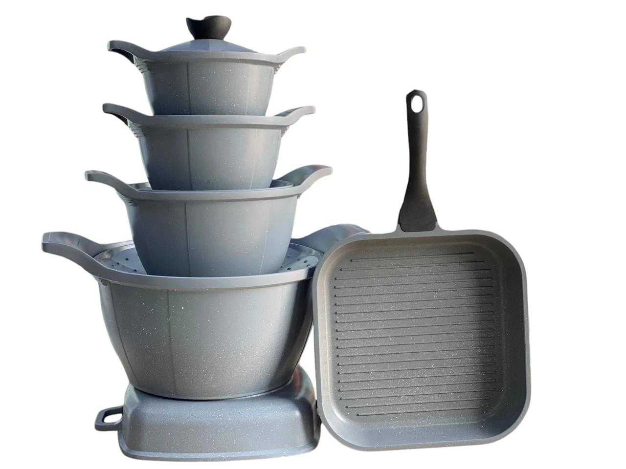 الطقم متكامل ومناسب لكل احتياجاتك اليومية في المطبخ، من الطهي السريع لوجبة خفيفة، لحد العزومات الكبيرة. تصميمه العصري باللون الرمادي الأنيق يضيف لمسة من الفخامة لمطبخك.