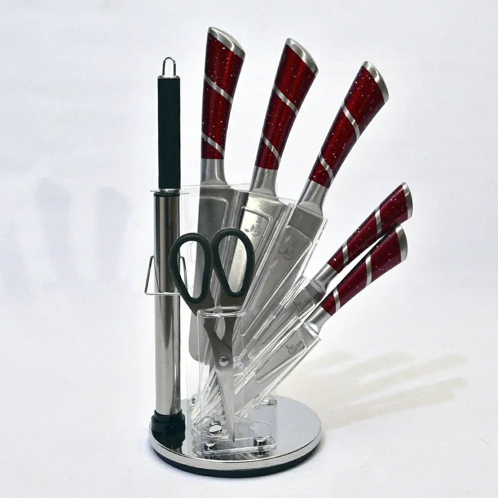 خلي كل خطوة في مطبخك أسهل وأشيك مع طقم سكاكين متكامل بلون أحمر ملفت ولمسة سيلفر أنيقة.