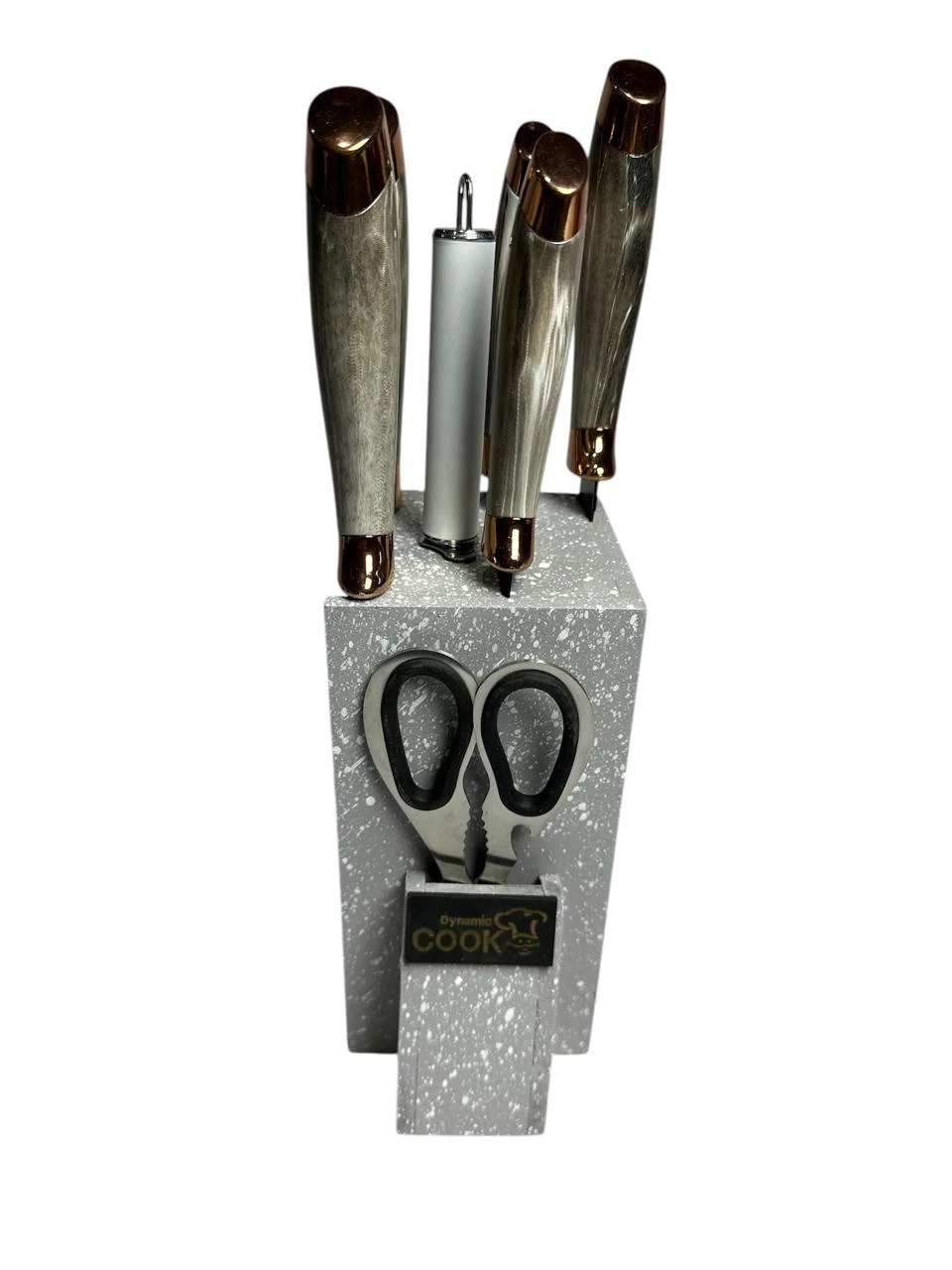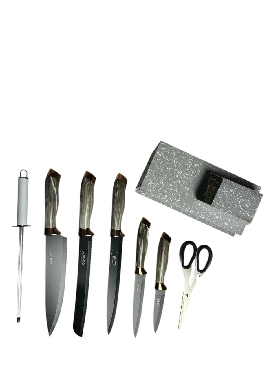 طقم سكاكين مكون من: 5 سكاكين بأحجام واستخدامات متنوعة + مسن + مقص، لتغطية كل احتياجاتك في المطبخ بدقة وراحة.