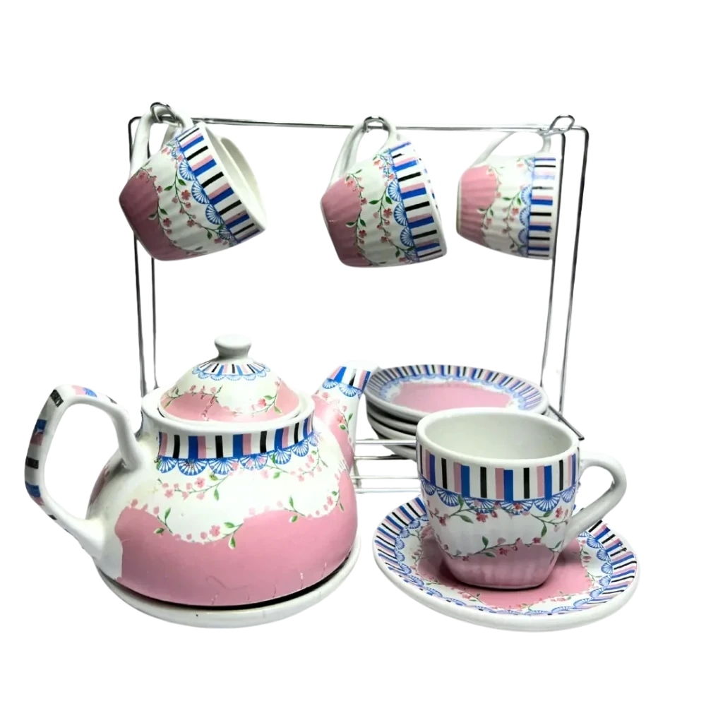 يأتي الطقم مع حامل عملي وأنيق لترتيب الفناجين والأطباق والبراد بشكل منظم وجذاب، مما يسهل تقديم الشاي بأسلوب جمالي وراقي.