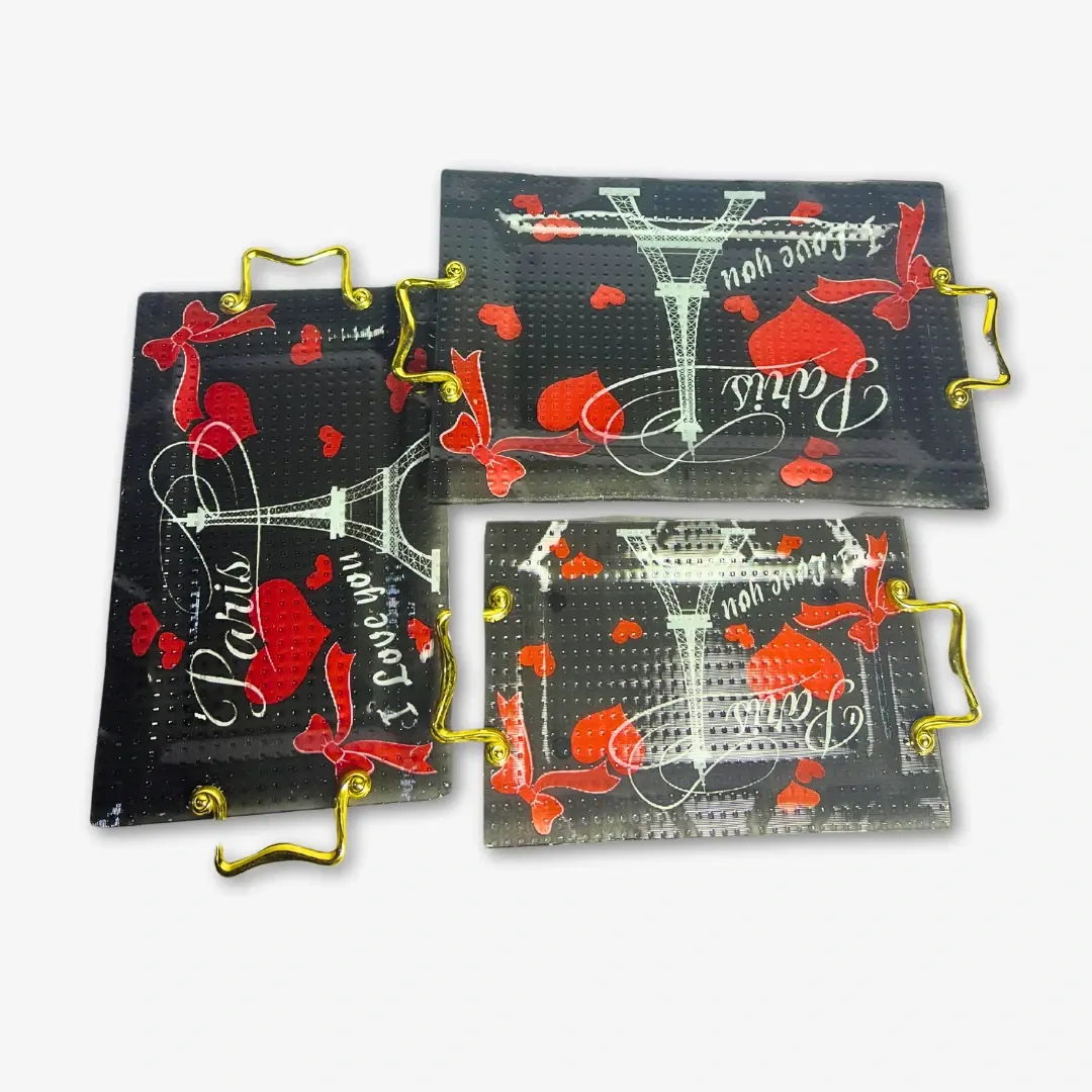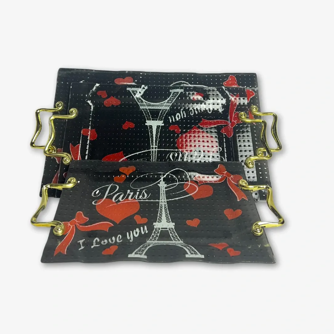 طقم صواني فاخر مكوّن من 3 قطع بأحجام مختلفة، مصنوعة من زجاج أركوبيركس عالي الجودة، بتصميم جذاب مزين برسمة برج إيفل باللونين الأسود والأحمر ليضفي لمسة فنية أنيقة على مطبخك أو مائدتك.