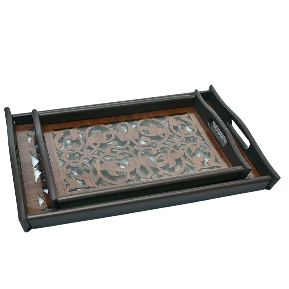 طقم صواني تقديم أنيق مكوّن من قطعتين بمقاسين مختلفين، يجمع بين خامة الخشب الطبيعية والزجاج الشفاف المزخرف برسومات أرابسك مميزة.