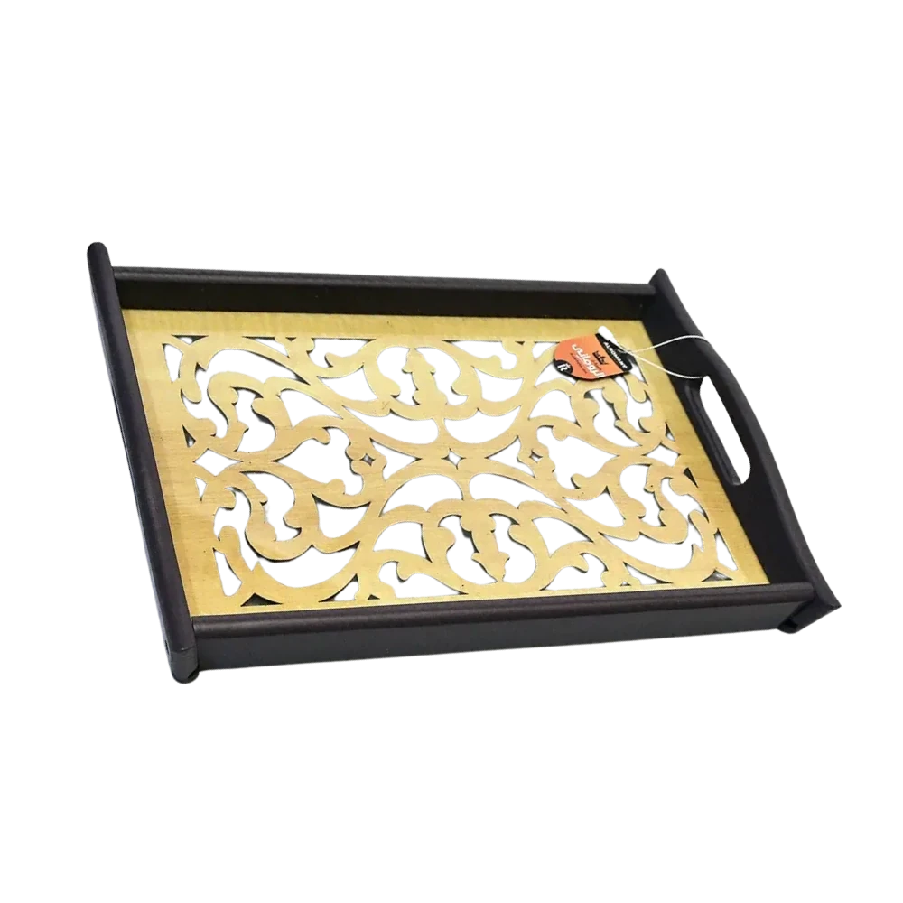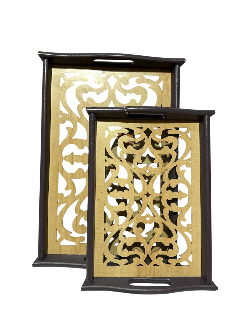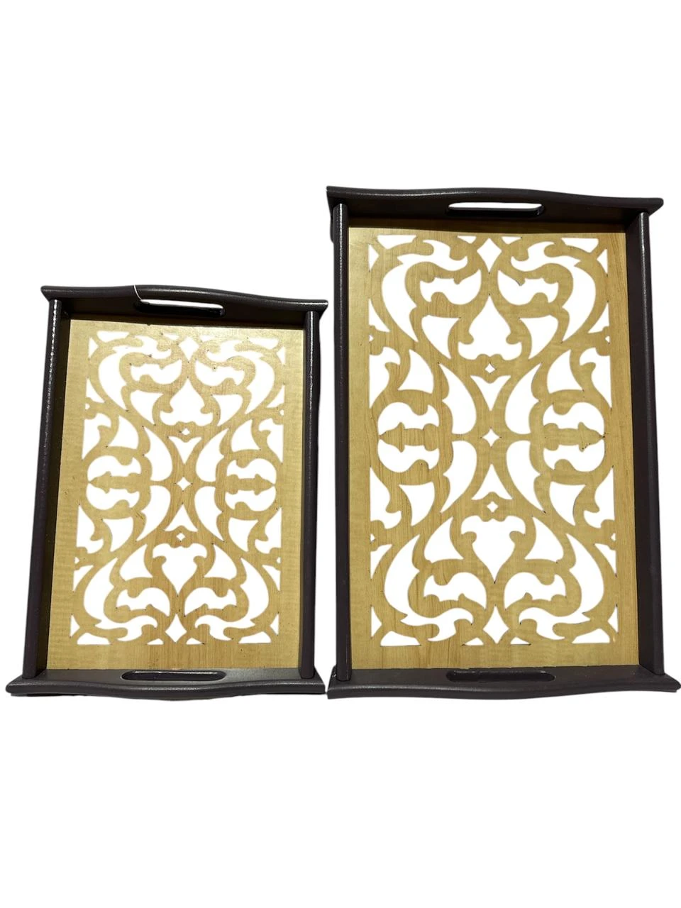 طقم صواني تقديم أنيق يتكون من قطعتين بمقاسين مختلفين، مصنوع من خشب طبيعي فاخر مع سطح زجاجي مزخرف برسومات أرابسك مميزة تضيف لمسة فنية أنيقة لمائدتك.