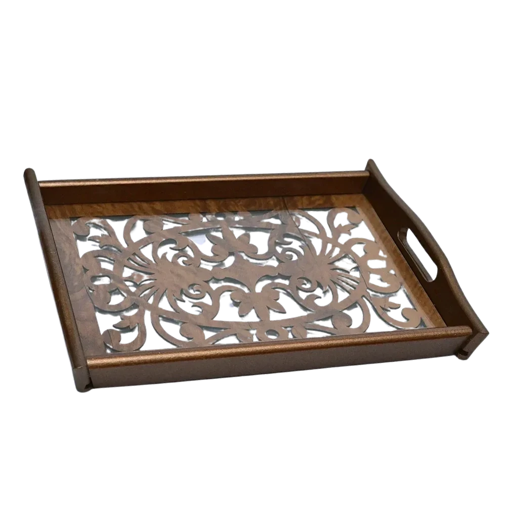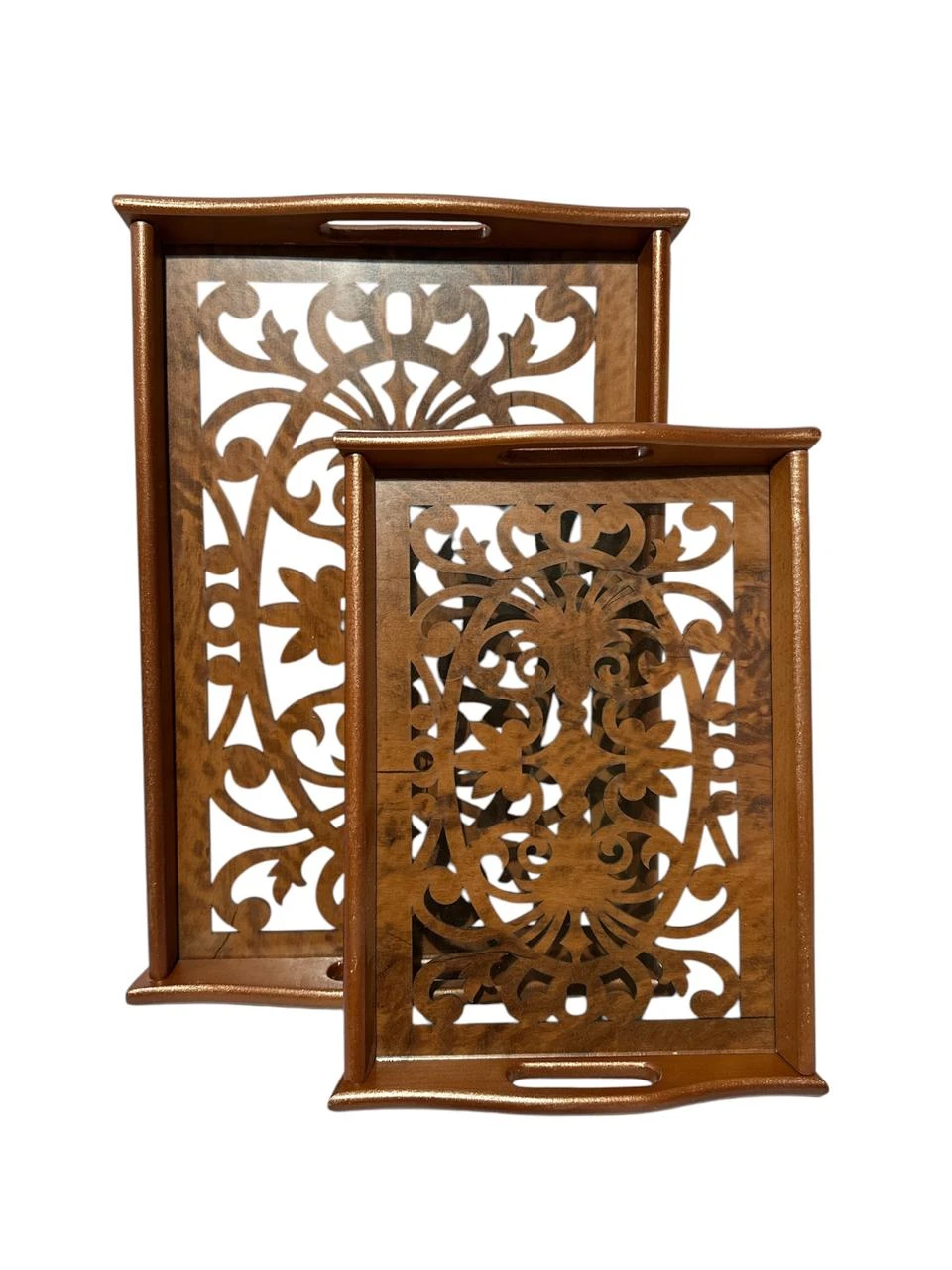 أضيفي لمسة من الأصالة والفن الشرقي لمائدتك مع طقم صواني تقديم فاخر مكون من قطعتين بمقاسين مختلفين، مصممة بخامة خشب متينة وزجاج شفاف مزخرف برسومات أرابيسك فريدة.