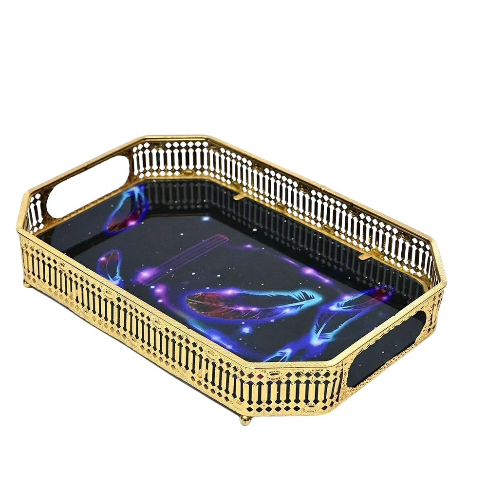 طقم صواني تقديم فاخر مكوّن من قطعتين مستطيلتين بمقاسين مختلفين، بإطار معدني مدهب يضيف لمسة من الأناقة والفخامة لأي مائدة.