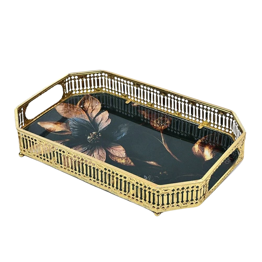 طقم صينية تقديم 2 قطعة مستطيل – معدن وزجاج ورد