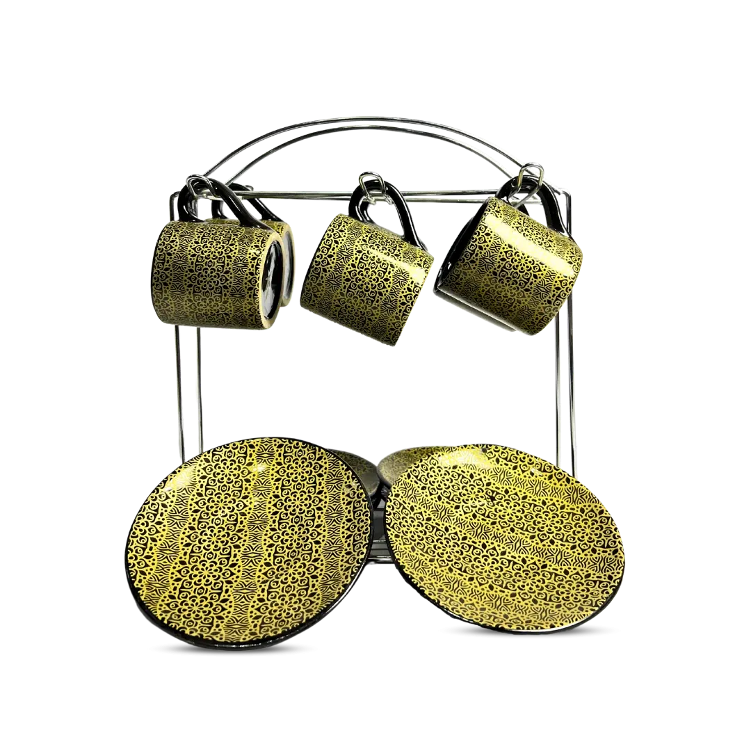 طقم قهوة بورسلين بالطبق 12 قطعة بالحامل – دهبي في أسود