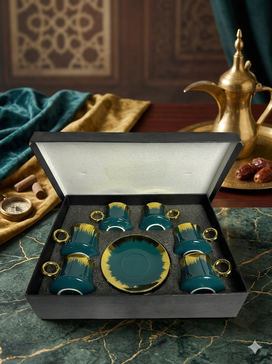 قهوة مكون من 6 فناجين قهوة و 6 أطباق فنجان مزخرفة، مع يدين بلون ذهبي لإضفاء