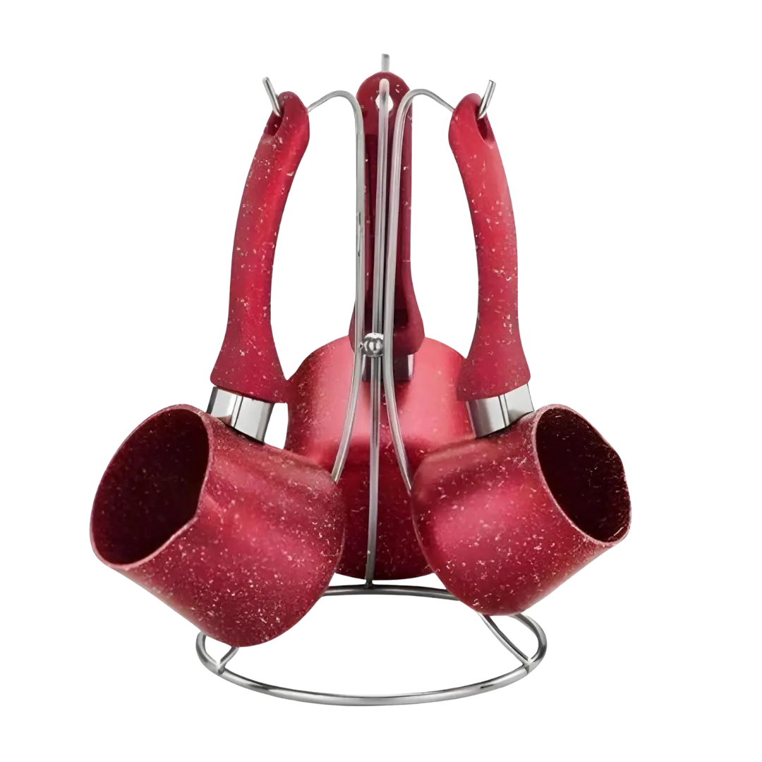 يتميز الطقم بـ حامل أنيق يساعد على ترتيب الكنك بشكل منظم وسهولة الوصول إليها، مما يجعله إضافة عملية لأي مطبخ. بفضل تصميمه المريح والمتين، فهو الخيار المثالي لمحبي القهوة والشاي الباحثين عن الأناقة والعملية في آنٍ واحد.