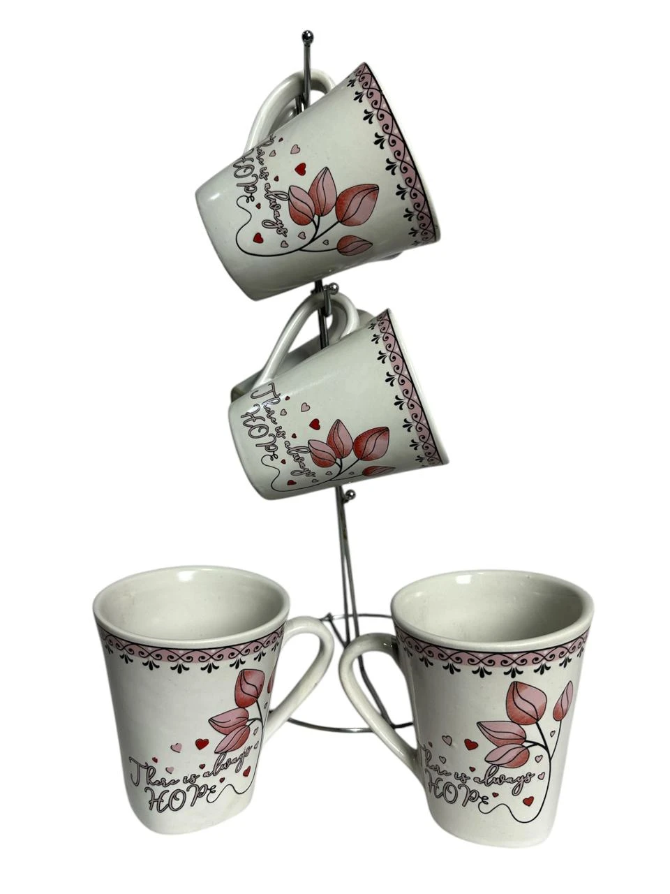 طقم مج كافية بورسلين 6 قطع بالحامل ابيض ورد