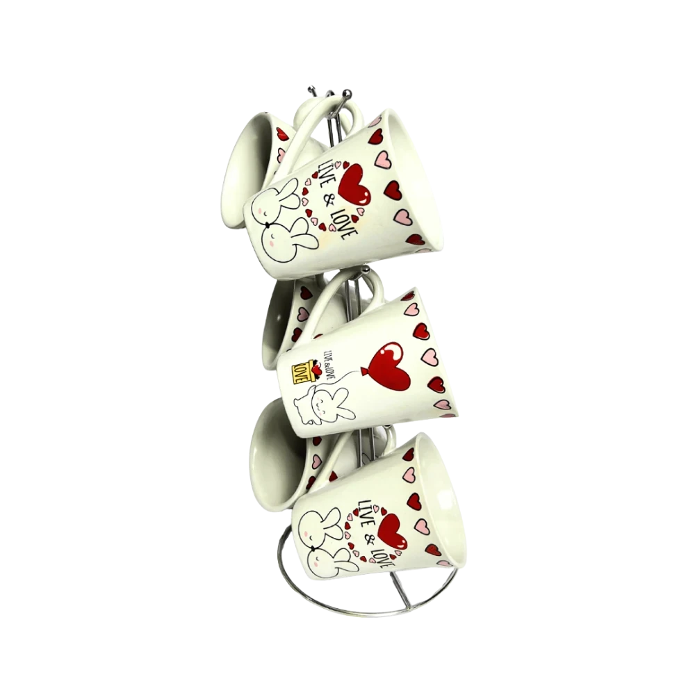 طقم مج كافية بورسلين – 6 قطع بالحامل (نقشة أرنب أبيض)