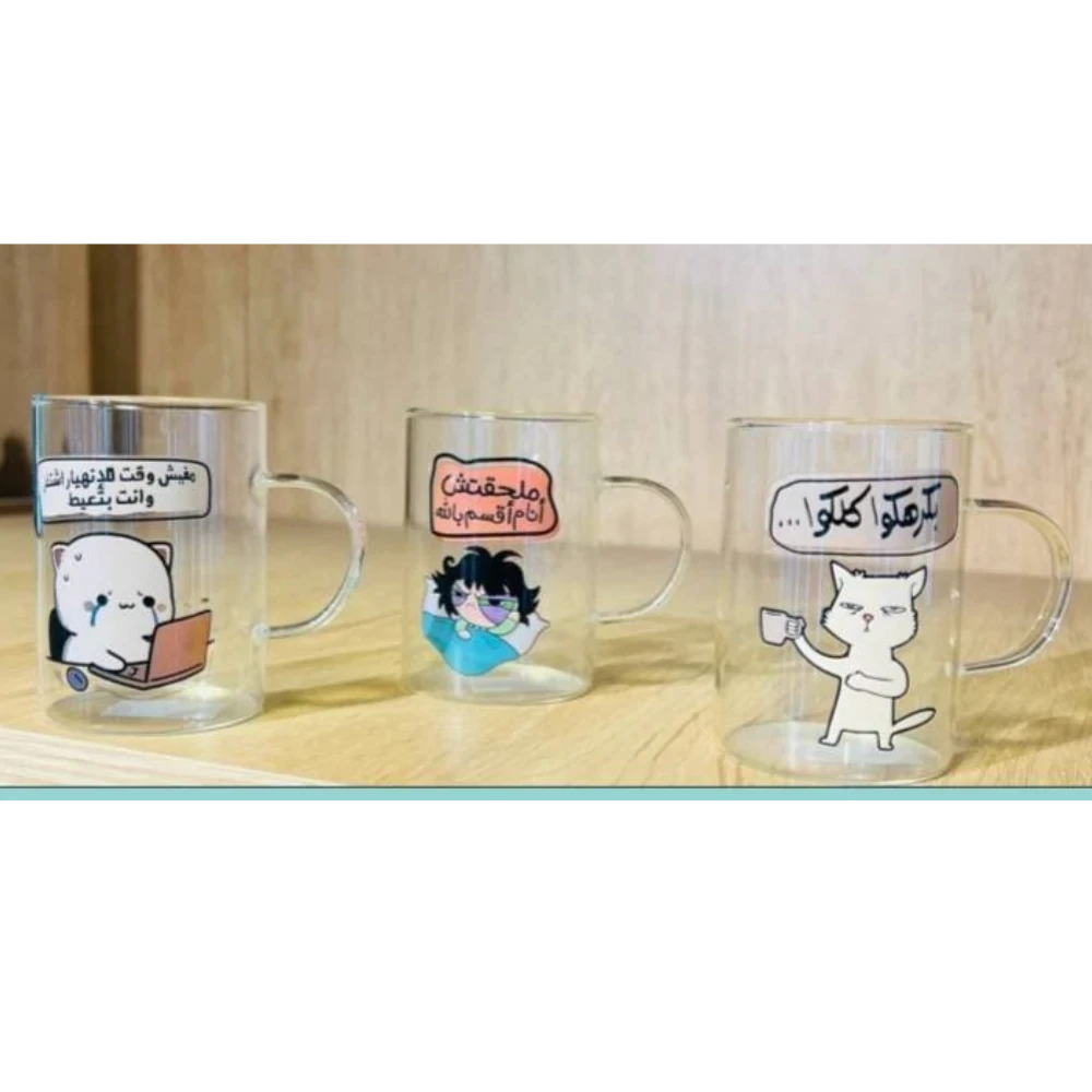 طقم فنجين قهوة زجاجي بتصميم كومكس المميز، مكون من 3 قطع متوسطة الحجم، برسومات فنية مستوحاة من عالم القصص المصوّرة تضيف لمسة مرحة وعصرية على كل رشفة.