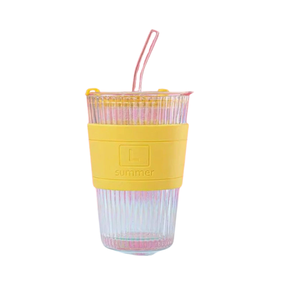 مج زجاجي أنيق بغطاء وشاليموه – لمسة عصرية لمشروباتك