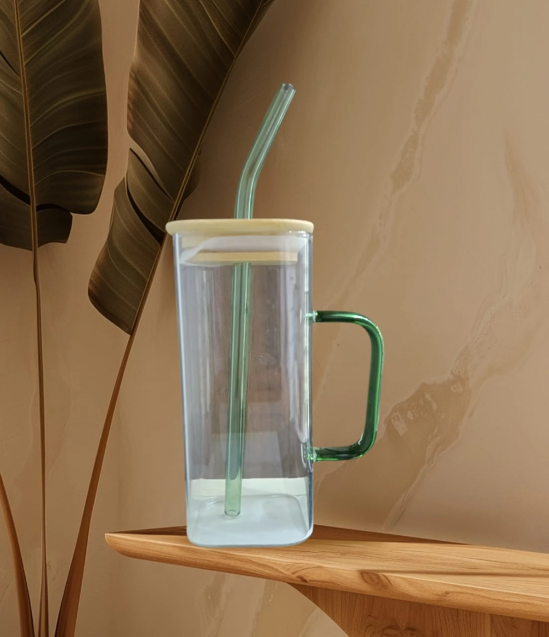 مج زجاج مربع بيد بغطاء خشب وشاليموه – أخضر