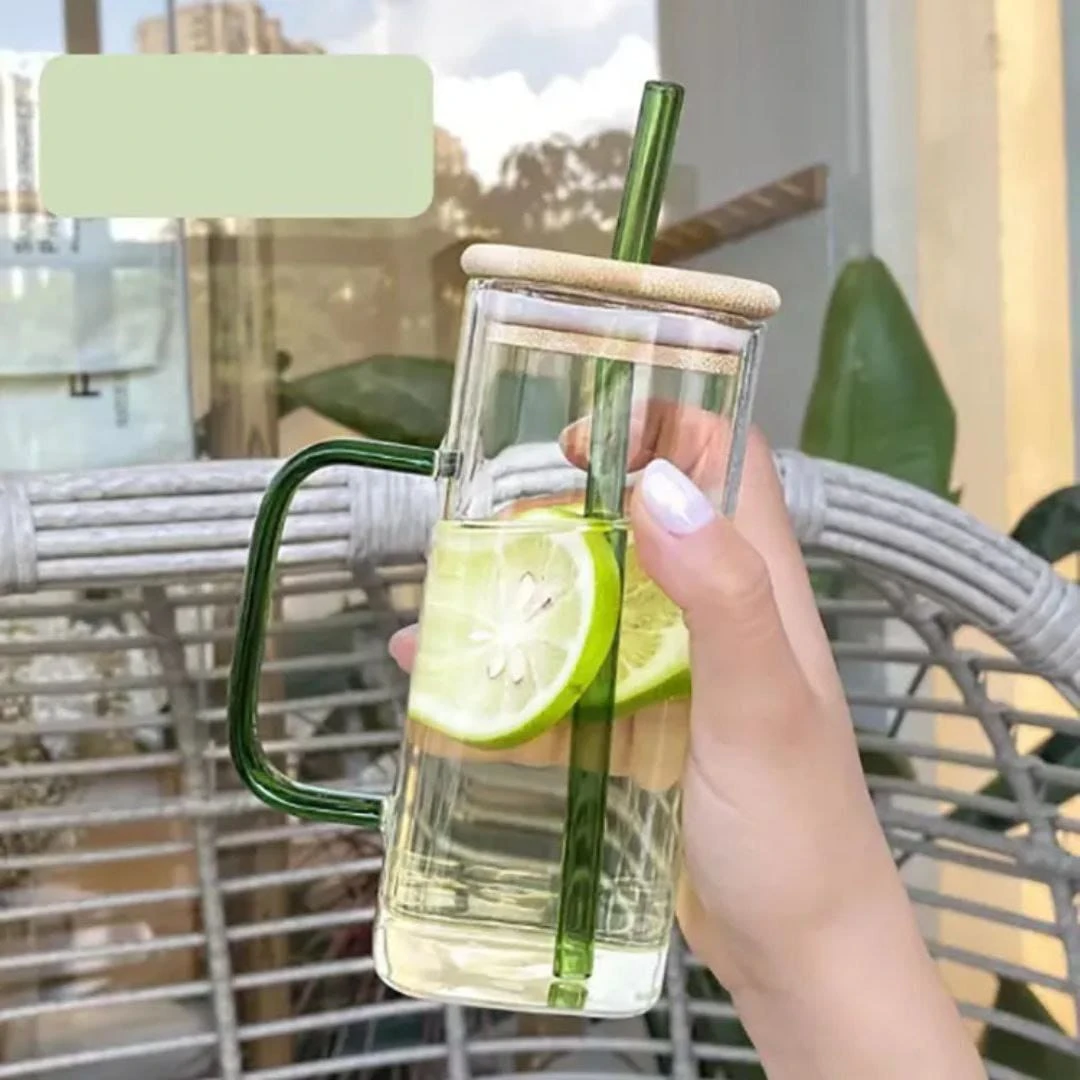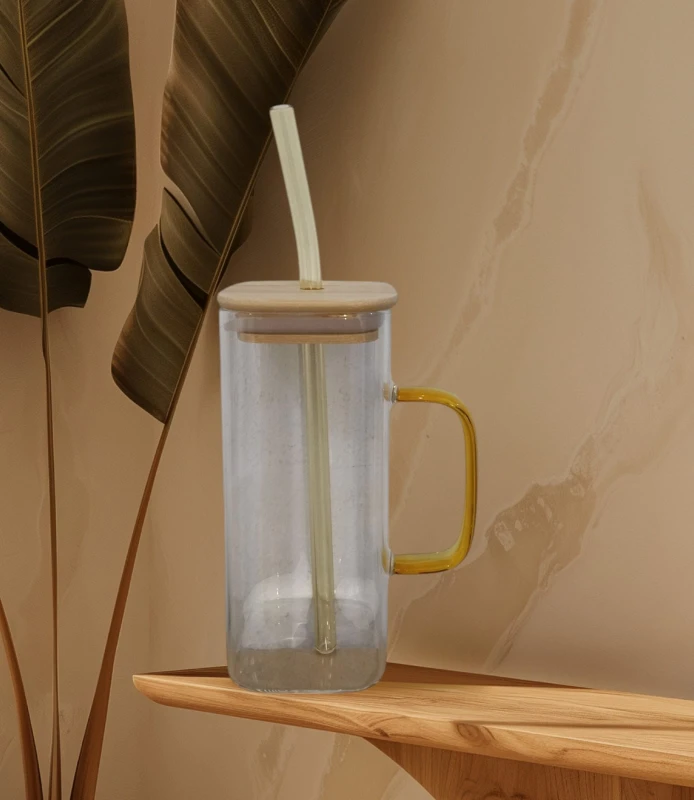 مج زجاجي أنيق بتصميم مربع مع يد مريحة وغطاء خشبي فاخر، مزود بـ شاليموه عصري، بلون عسلي دافئ يضفي لمسة راقية على مشروباتك.