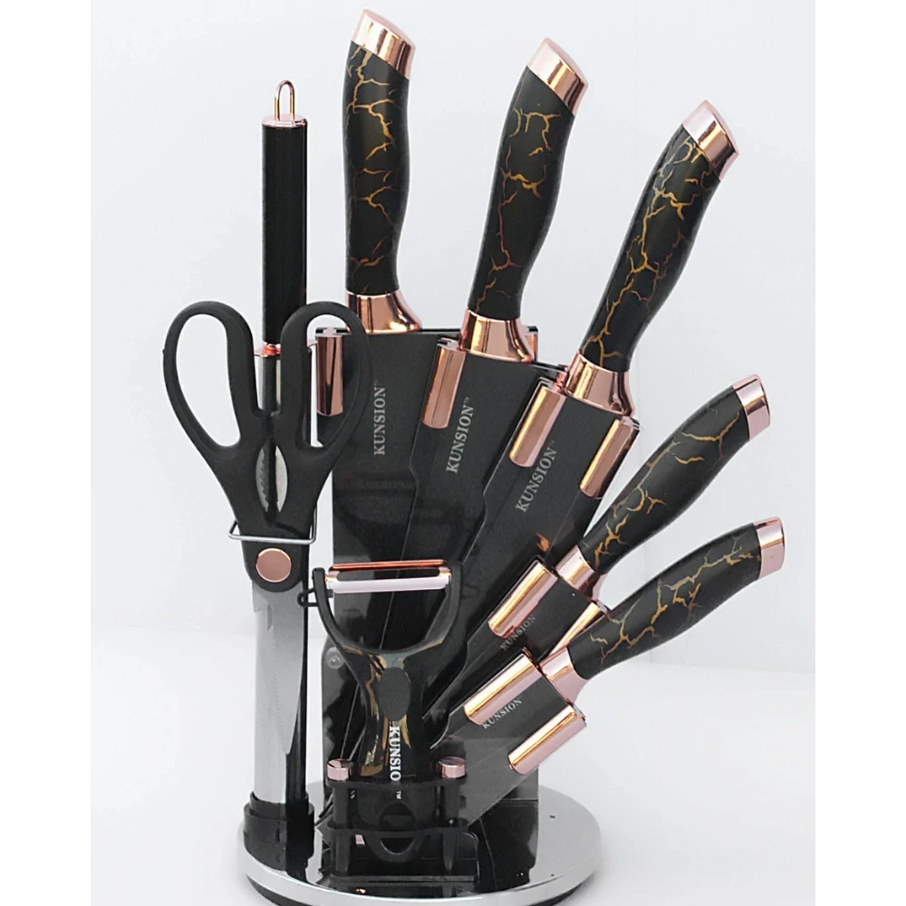 طقم سكاكين مميز يتكون من 5 سكاكين بأشكال ومقاسات مختلفة، بالإضافة إلى مسن ومقص، لتلبية جميع احتياجاتك في المطبخ بكل سهولة ودقة! كل سكينة مصنوعة كقطعة واحدة لضمان المتانة وطول فترة الاستخدام، ومع التصميم الرشيق اللي بيخلي شكلها زي المروحة، هيضيف لمسة فخمة لمطبخك. مع الطقم ده، هتستمتعي بكل لحظة في المطبخ بفضل جودته العالية وأدائه الممتاز في التقطيع والتحضير. خلي كل مهمة في المطبخ تكون أسهل وأكثر أناقة