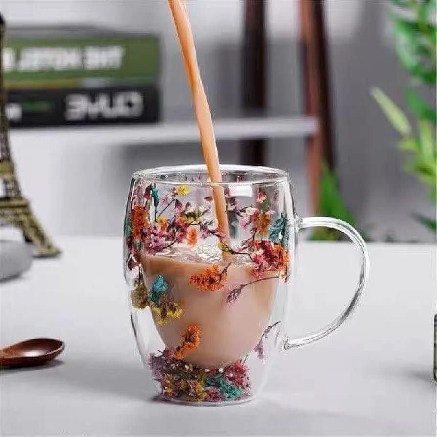 مج زجاجي شفاف بطبقتين – لمسة فنية راقية مج زجاجي بتصميم مميز يحتوي على طبقتين، وبينهما ورود مجففة تضفي لمسة طبيعية أنيقة. يجمع بين الجمال والعملية، حيث يبرز التفاصيل الفنية الفريدة، مما يجعله خيارًا مثاليًا لتقديم المشروبات بإطلالة جذابة ومميزة.