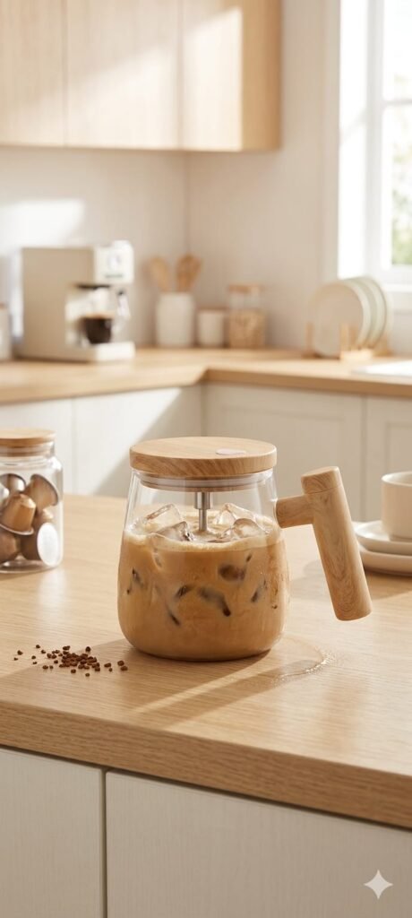 مج زجاج انيق مزود بغطاء خشبي به مضرب نسكافيه لخفق خليط النسكافيه يعمل بالكهرباء قابل للشحن تايب سي او بالحجارة لتستمتعي بمشروبك المميز خارج البيت و في الرحلات